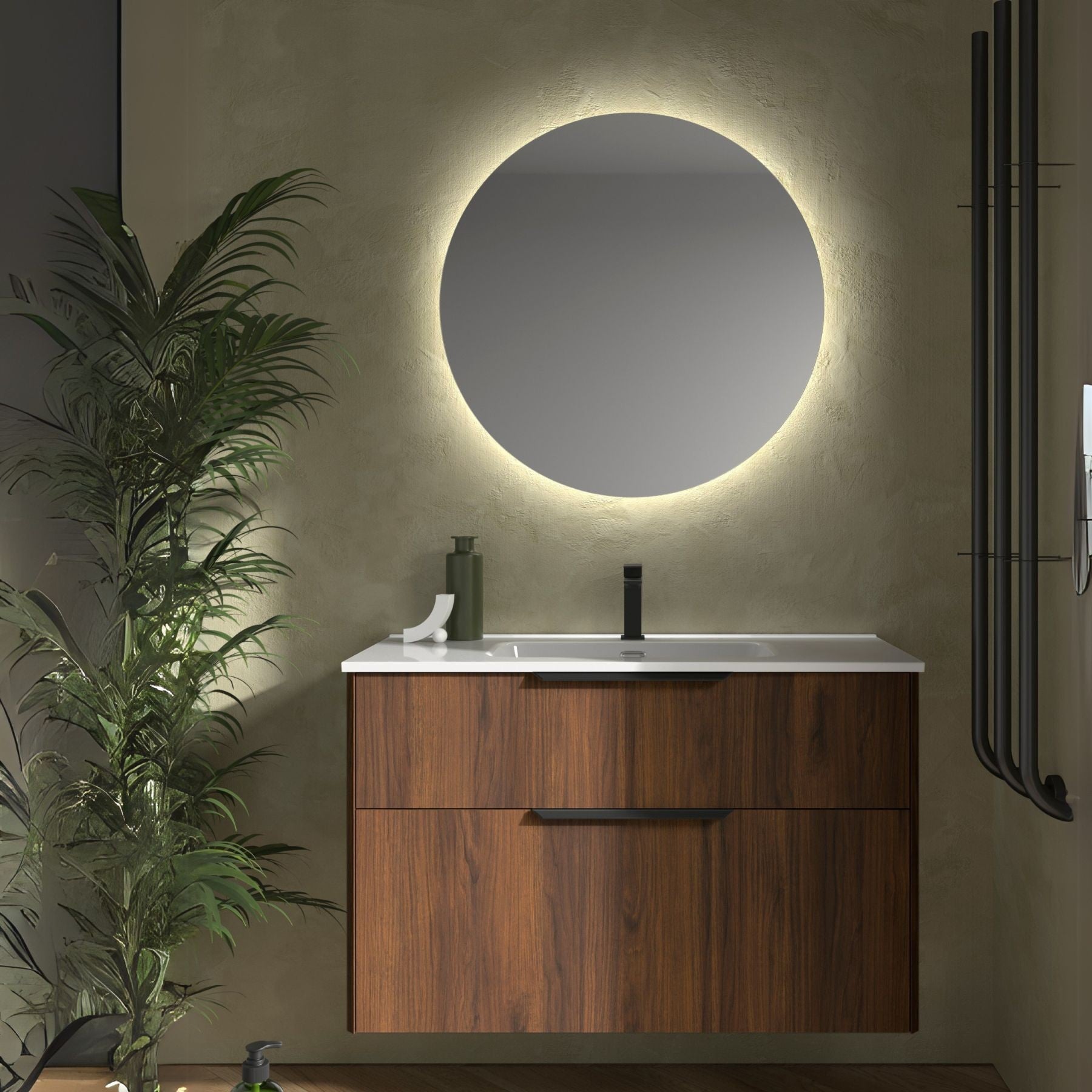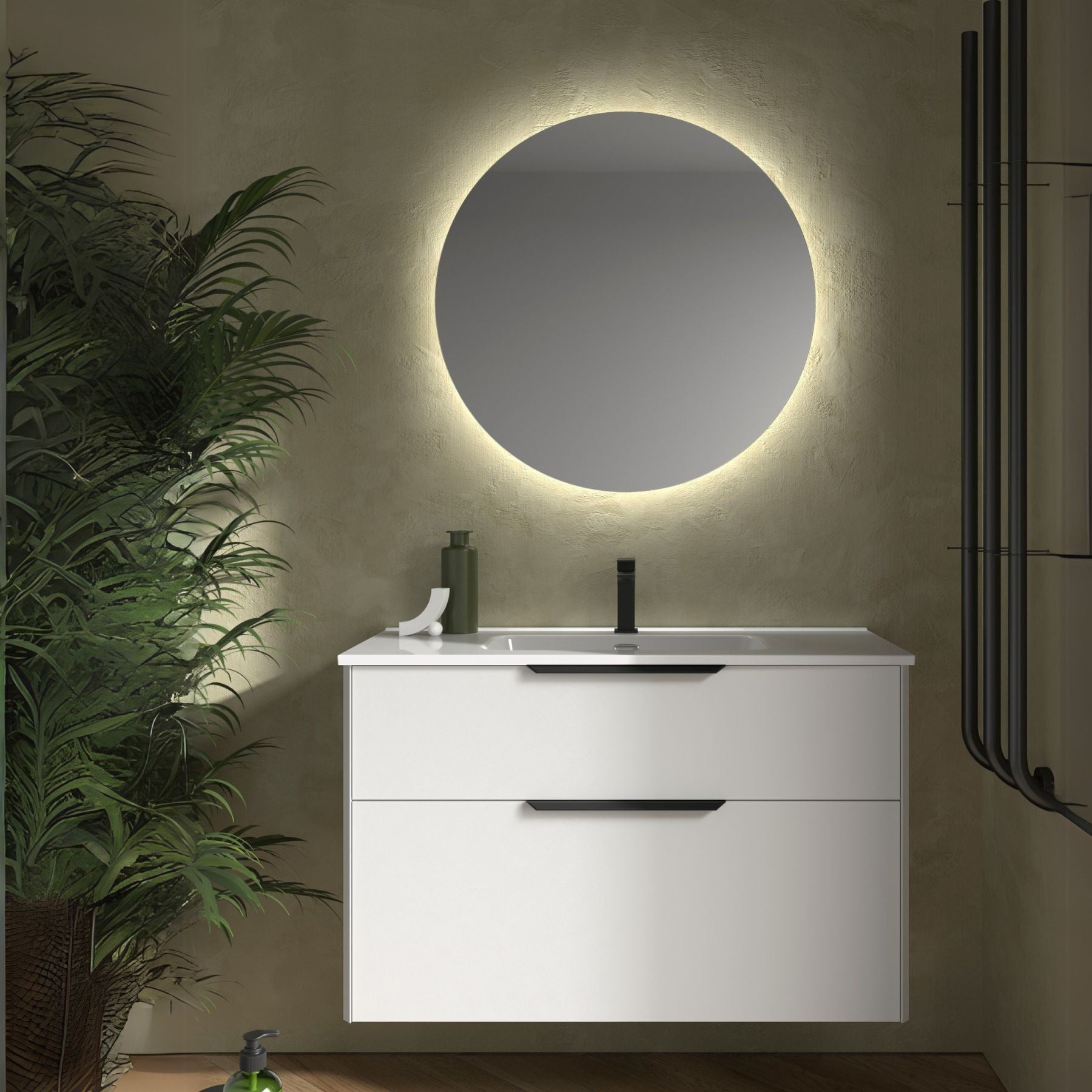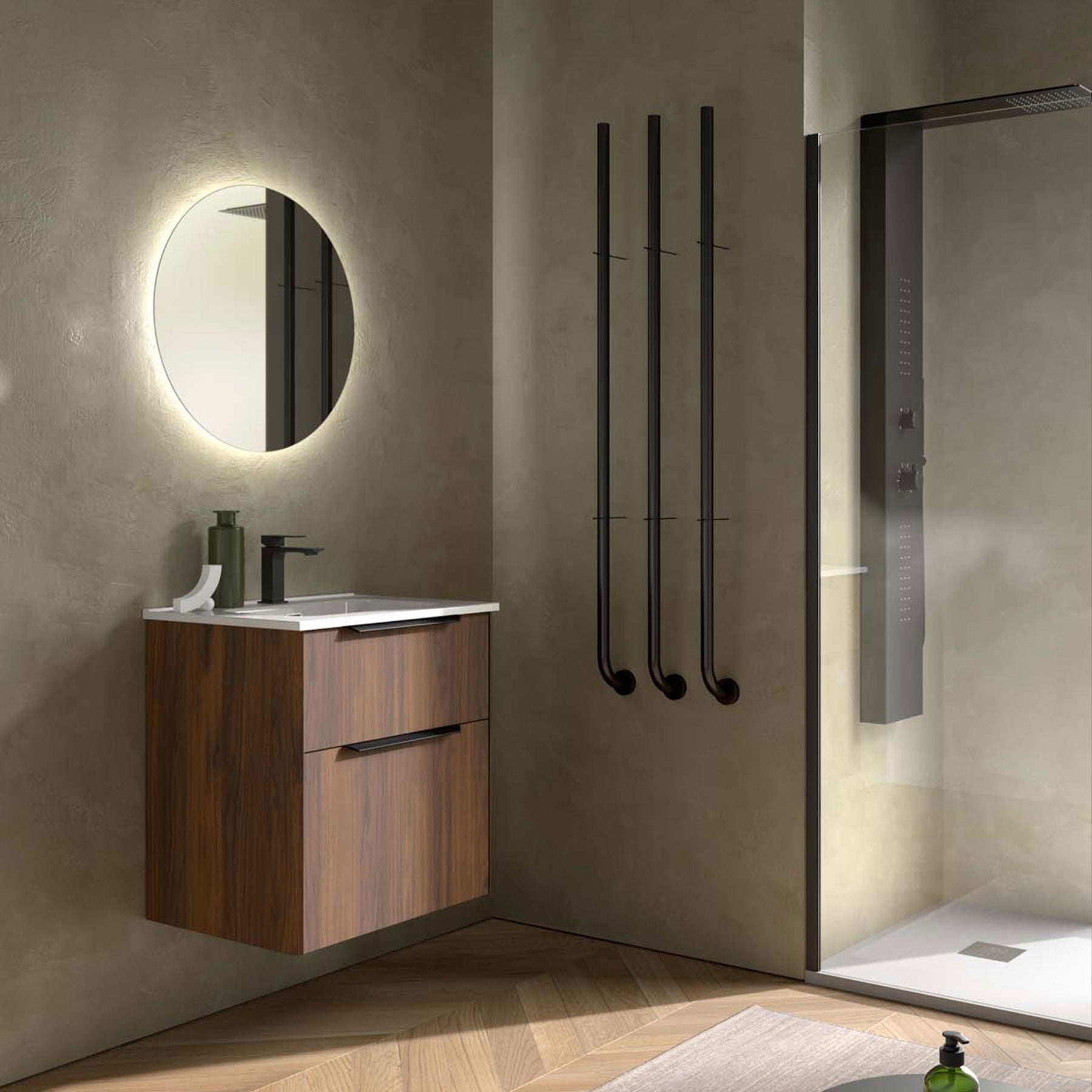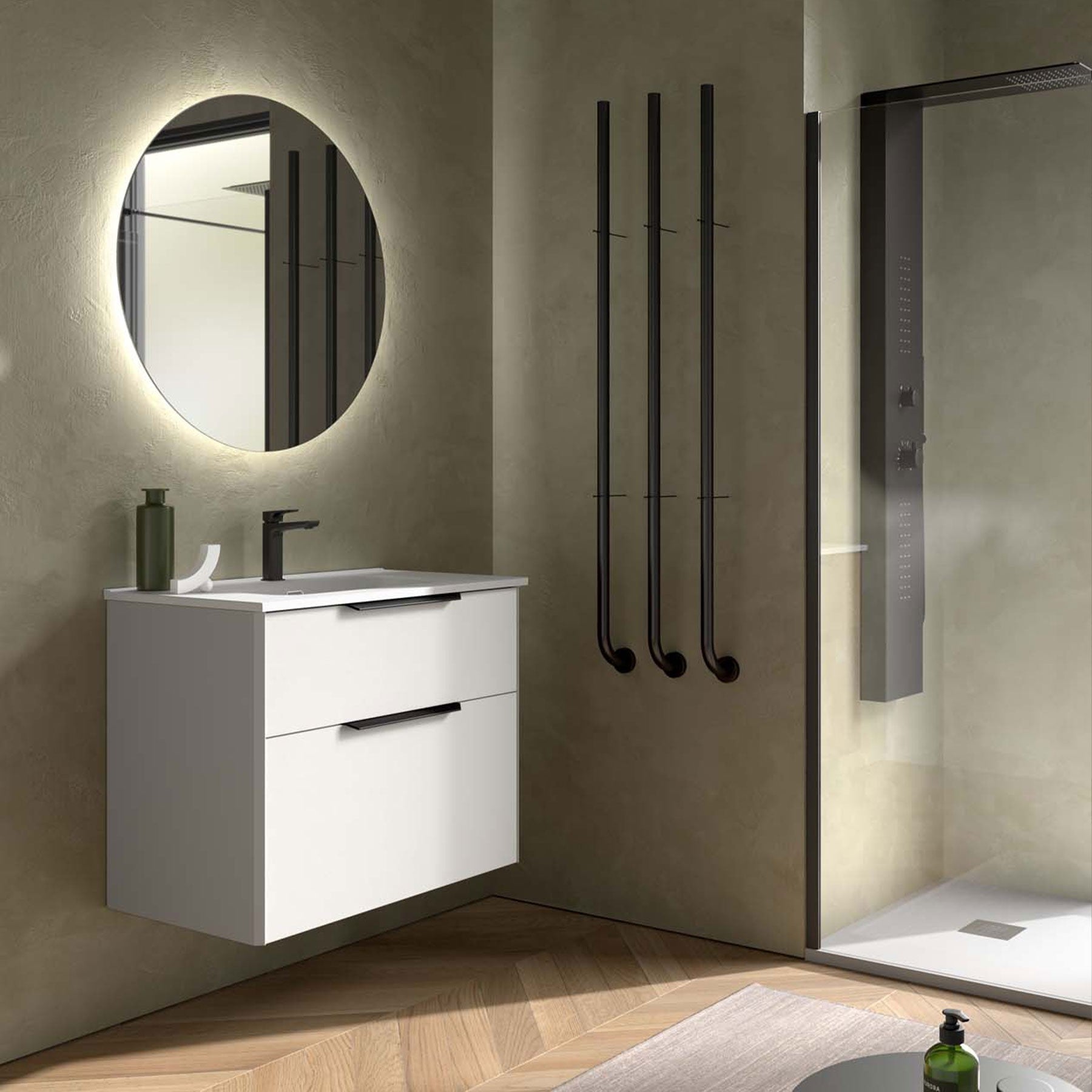 El conjunto incluye el espejo NORA con iluminación LED frontal vertical, que ofrece una luz cálida, envolvente y sin sombras, ideal para tus rutinas diarias. Su estilo sobrio y equilibrado realza la verticalidad del conjunto, integrándose con elegancia en cualquier baño.