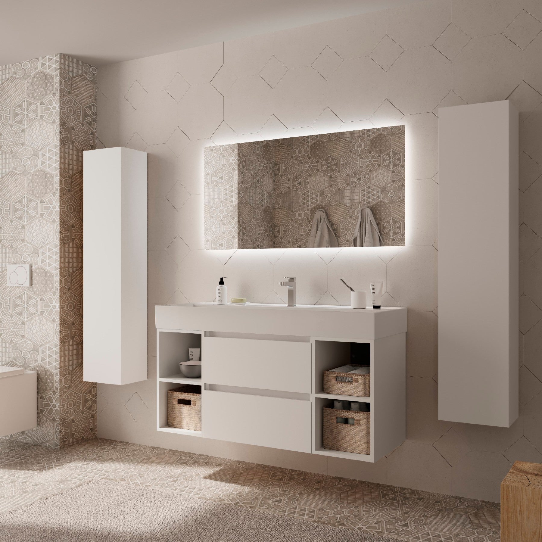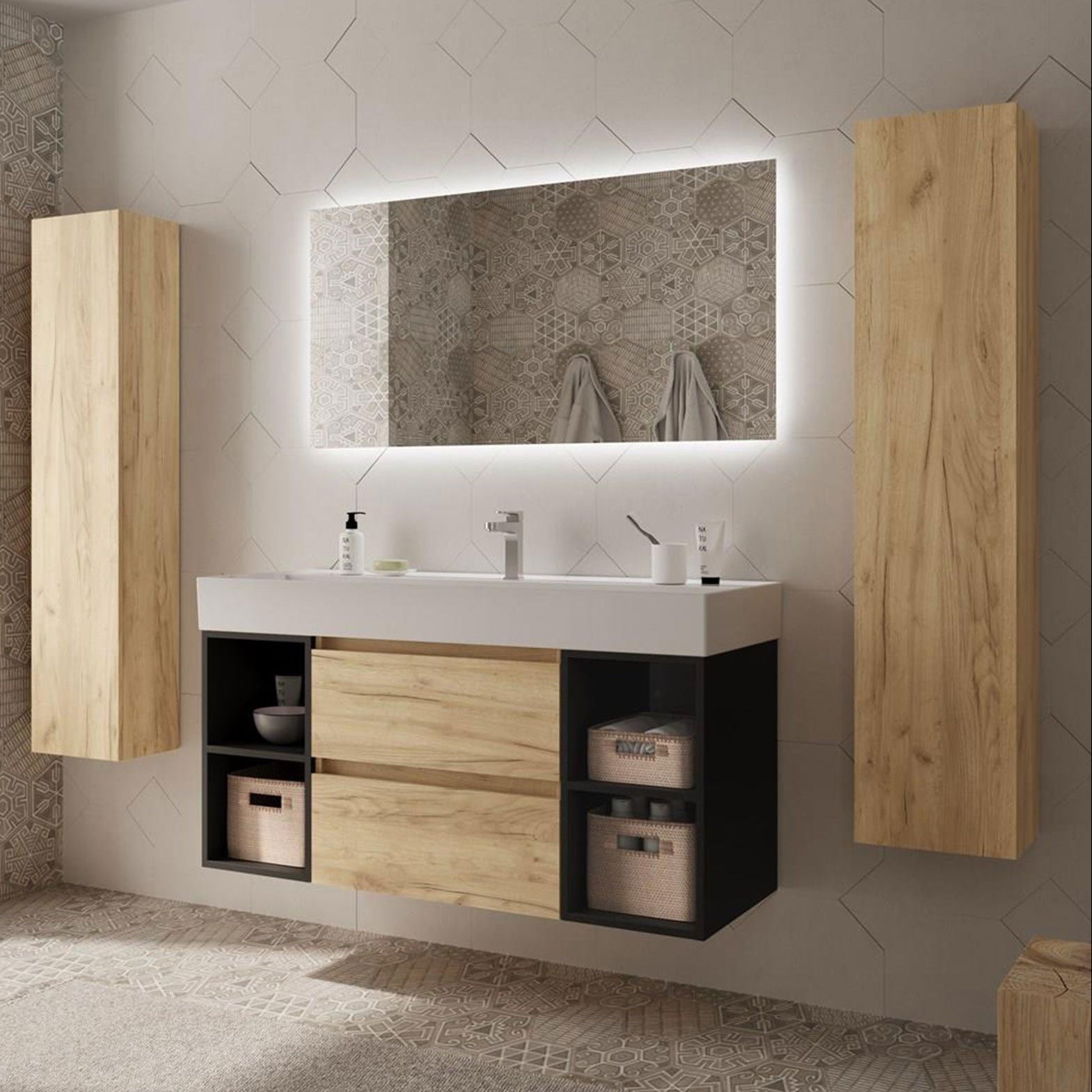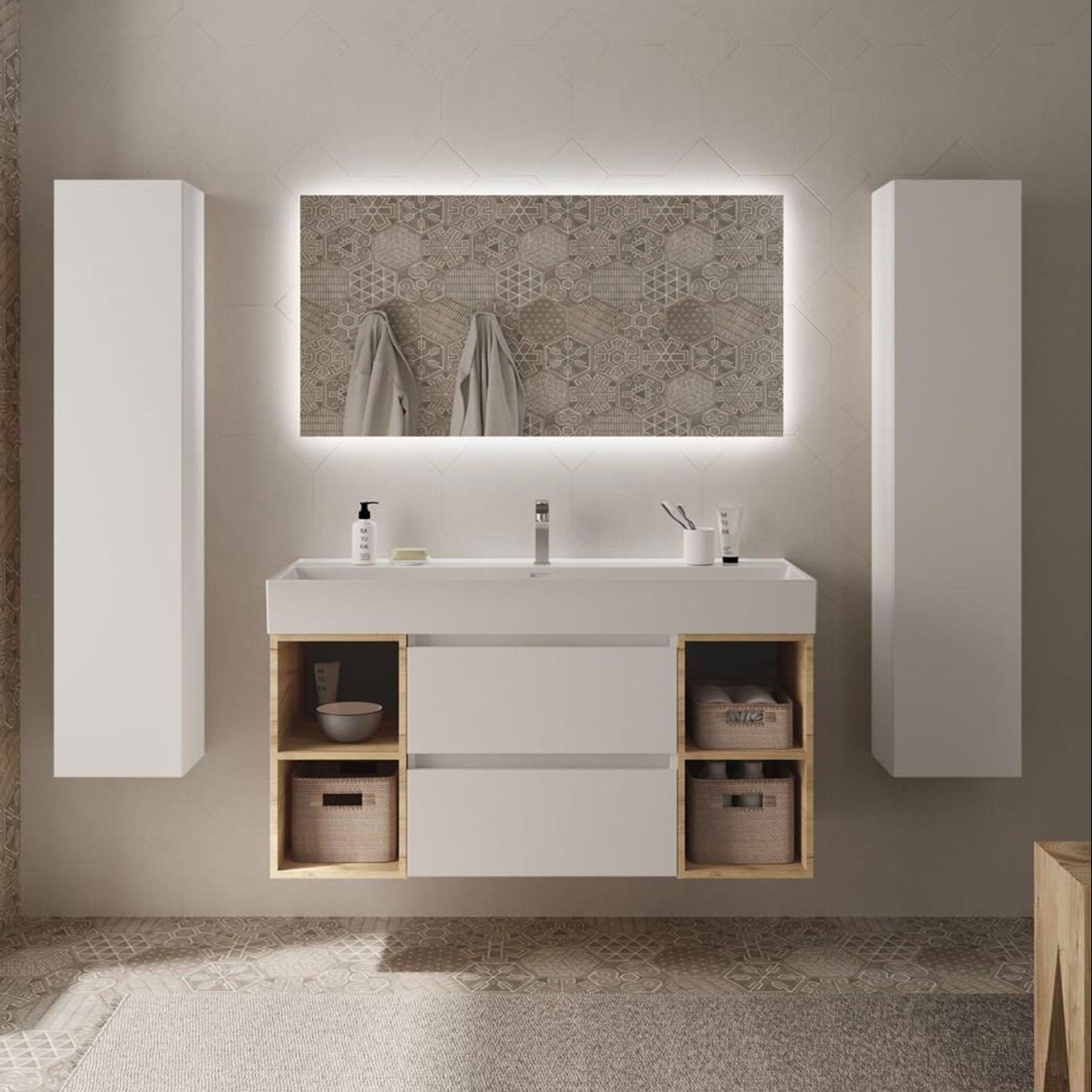 Este conjunto incluye un mueble suspendido de 2 cajones, 2 coquetas laterales abiertas y el elegante lavabo Veneto de porcelana blanca brillo, aportando equilibrio, ligereza y funcionalidad a cualquier baño contemporáneo.