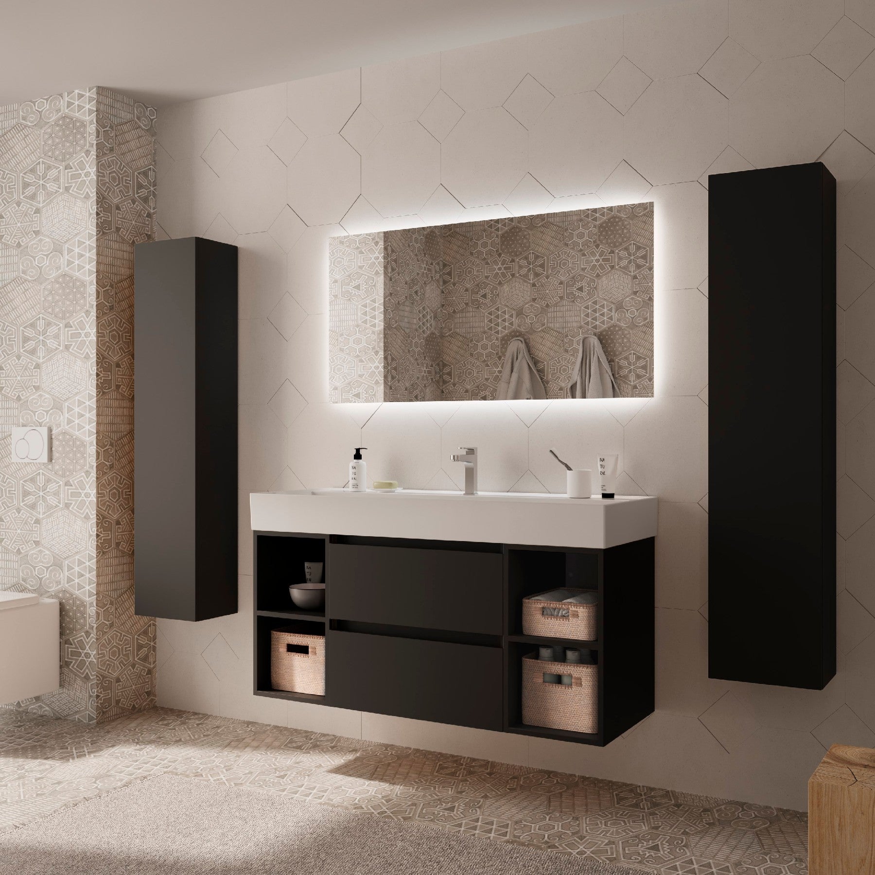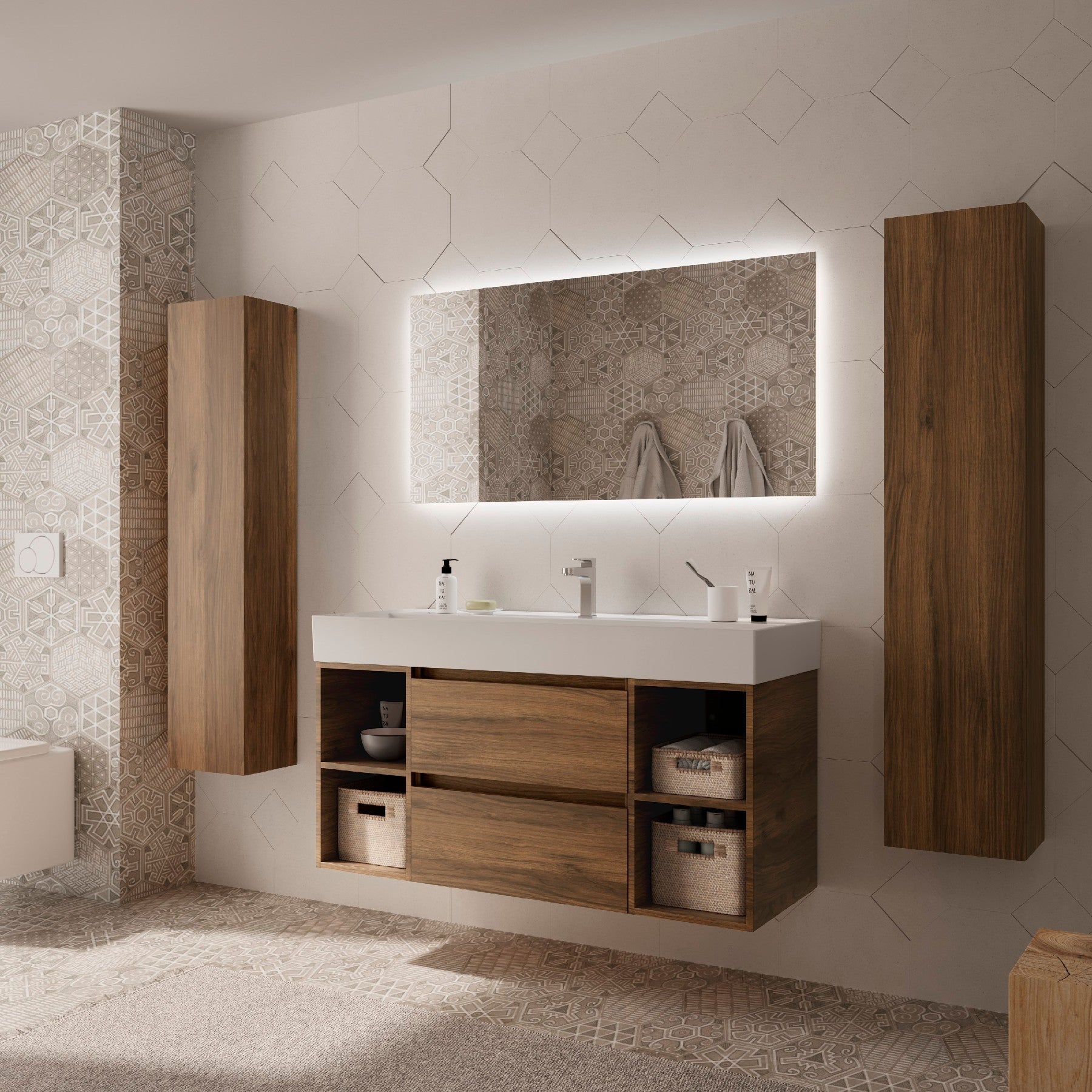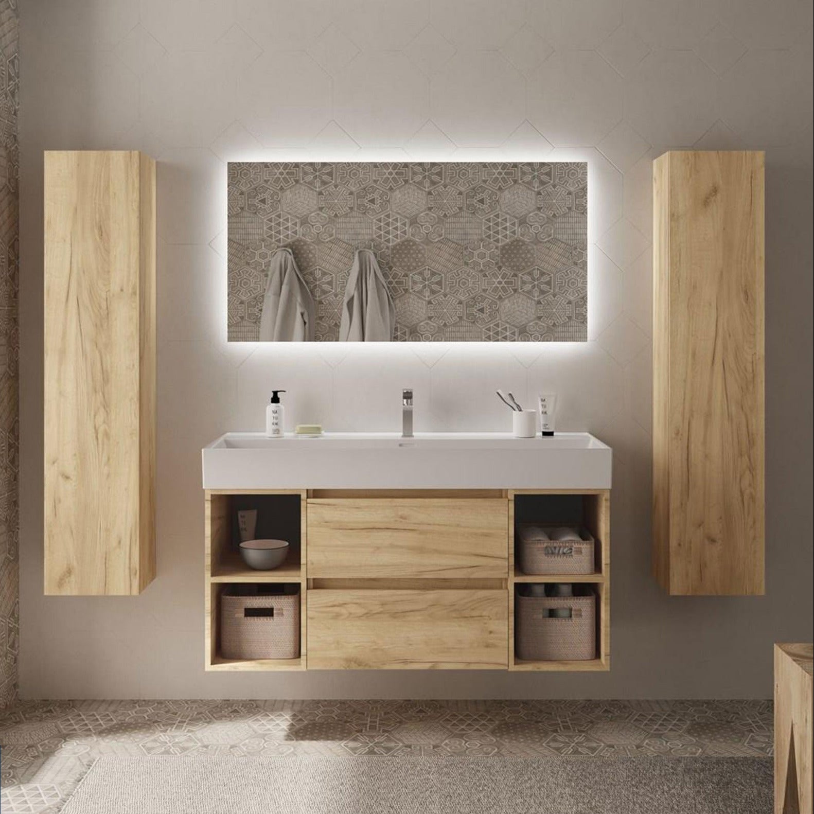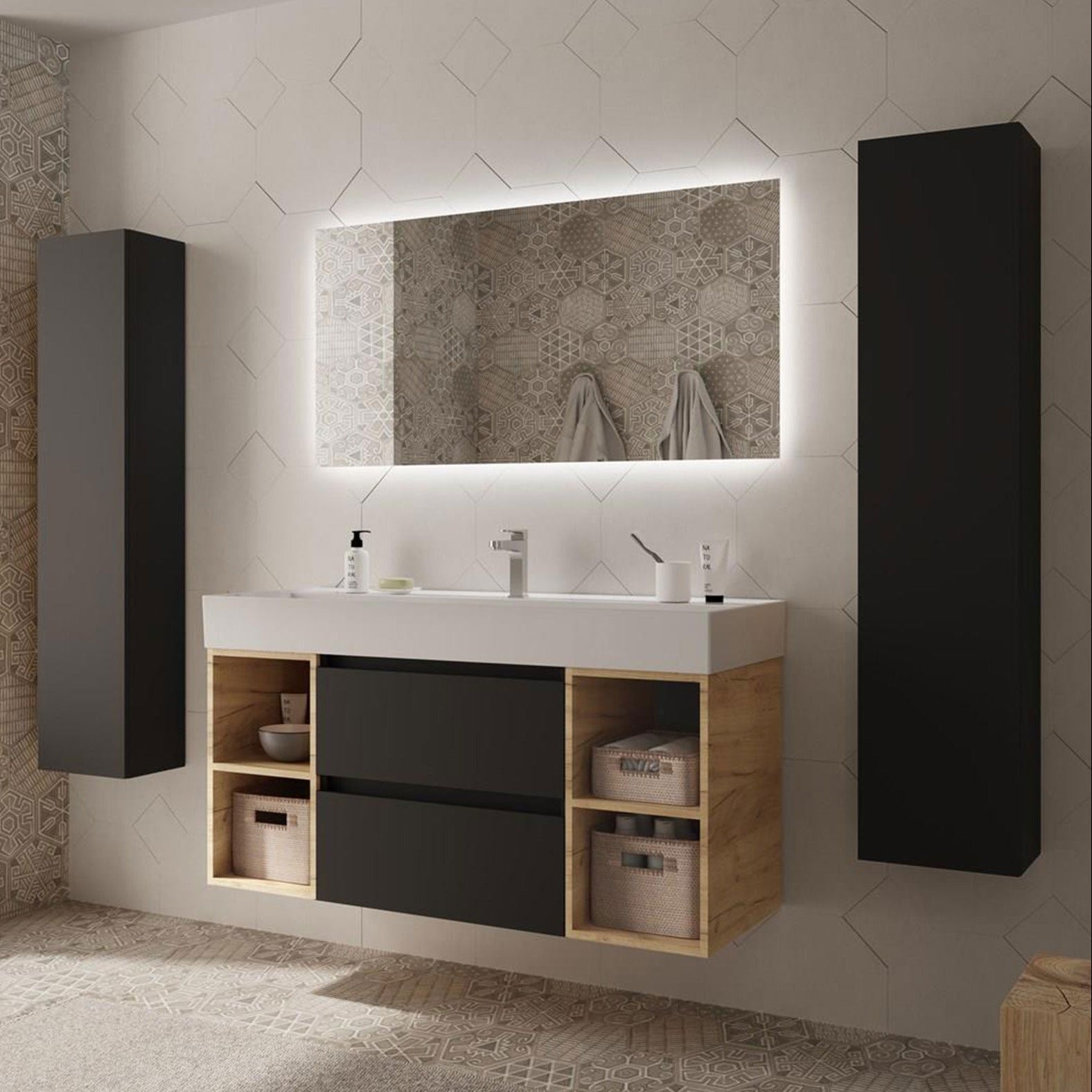 Este conjunto incluye un mueble suspendido de 2 cajones, 2 coquetas laterales abiertas y el elegante lavabo Veneto de porcelana blanca brillo, aportando equilibrio, ligereza y funcionalidad a cualquier baño contemporáneo.