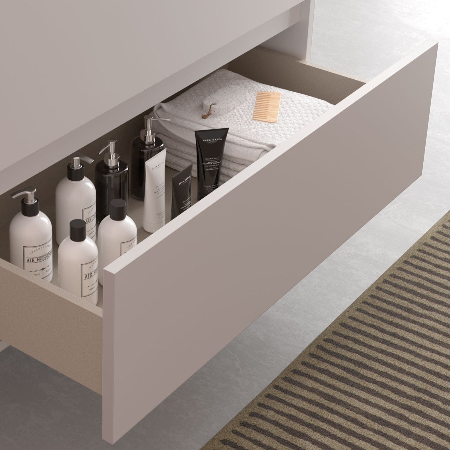 Sus dos amplios cajones con cierre amortiguado garantizan un uso suave y silencioso, mientras que los interiores en acabado Nude con textura cuero aportan un toque de distinción. Las coquetas laterales con huecos amplían la capacidad de almacenamiento y permiten tener a mano los utensilios y productos de higiene diaria.