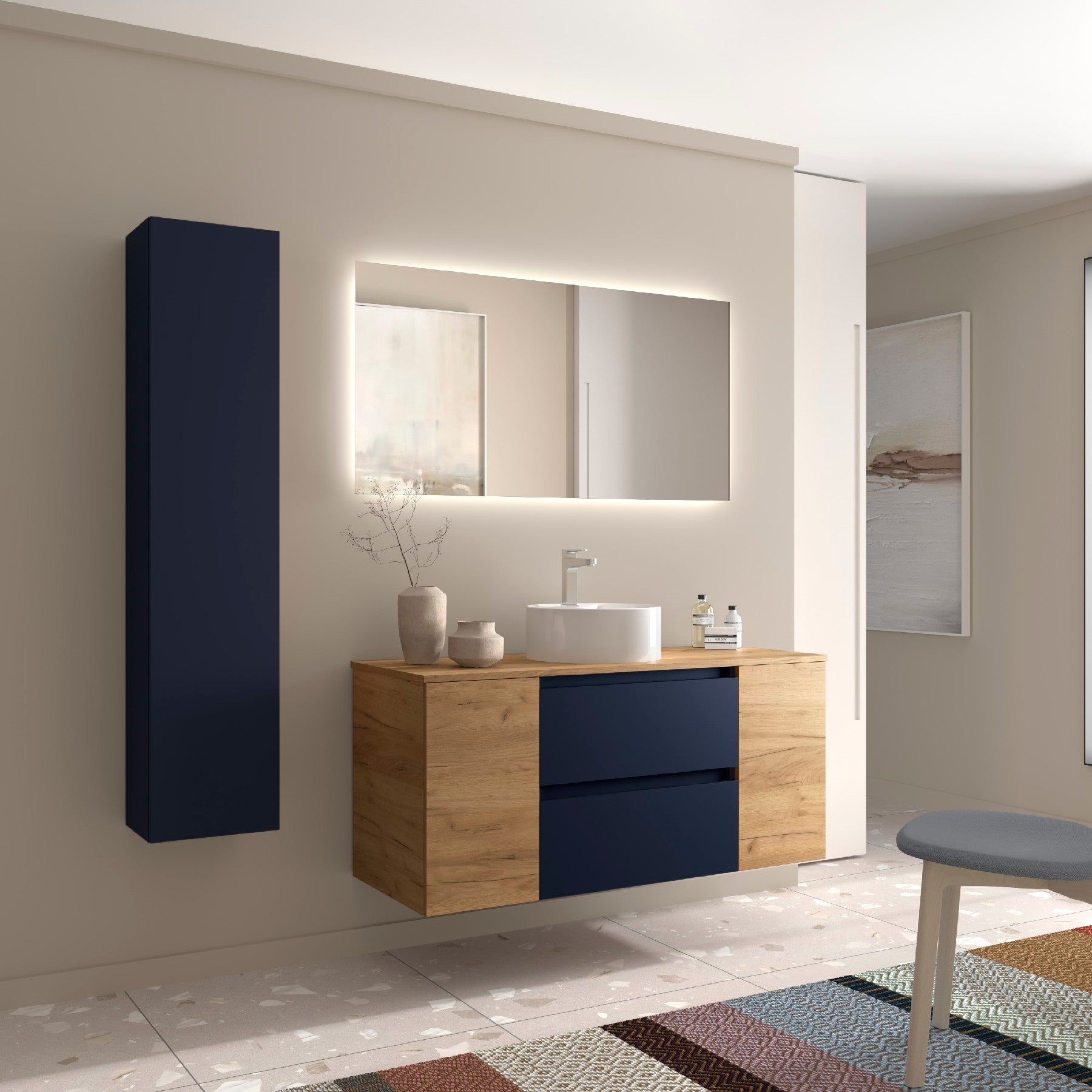 El lavabo de posar LISBOA de porcelana blanca brillo, con su acabado elegante y resistente, aporta luminosidad y un aire de sofisticación al conjunto. La encimera de 120 cm y 16 mm de grosor completa el diseño, ofreciendo una superficie sólida y estilizada.