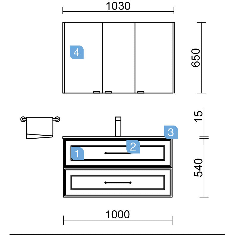 Mueble de baño RENOIR 1000 con 2 cajones metálicos (997 x 540 x 450 mm), diseñados con guías de alta calidad y cierre amortiguado.