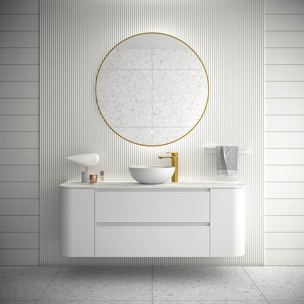 Lavabo de posar ALTIRO en porcelana blanca mate (Ø 390 x 140 mm), que aporta un toque sofisticado y minimalista.