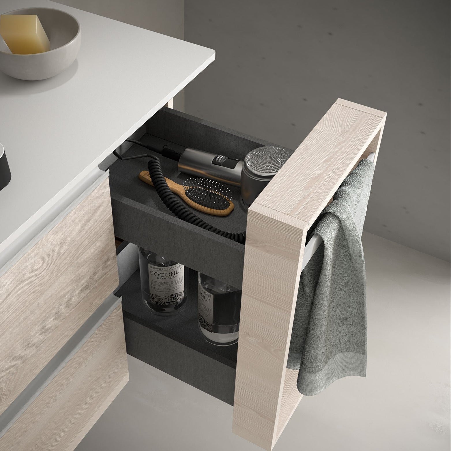 Aporta un toque de modernidad y orden a tu baño con la Coqueta ALLIANCE 300 de Salgar, un mueble auxiliar suspendido con toallero extraíble y cajones interiores que combina diseño, elegancia y funcionalidad.