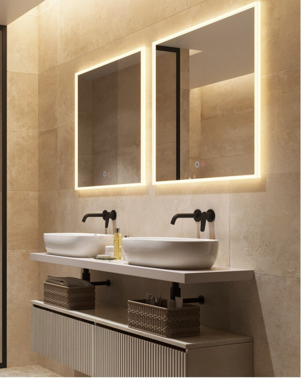 Incluye doble sensor táctil: uno para encendido/apagado (On/Off) y otro antivaho, ideal para mantener la superficie libre de condensación tras la ducha.