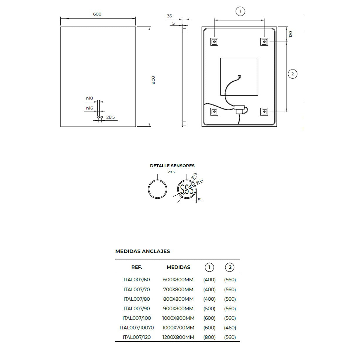 Disponible en múltiples medidas —alto de 70 y 80 cm y ancho de 60 a 120 cm—, el espejo LED ITALIA se adapta fácilmente a cualquier tipo de baño, aportando estilo y luminosidad a tu espacio.