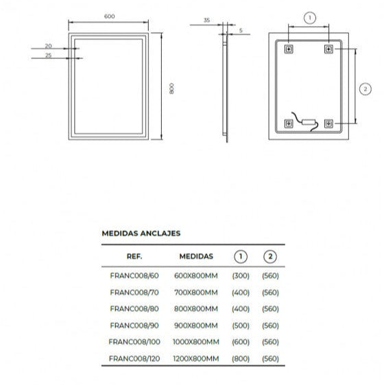 Disponible en diferentes medidas —alto 80 cm y anchos de 60 a 120 cm—, el espejo Francia se adapta perfectamente a cualquier estilo de baño, aportando un toque de sofisticación y modernidad.