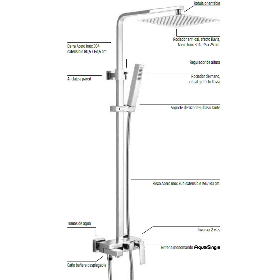 Kit Ducha MITRA Aquassent Especial Bañera | Barra Extra Alta 80.5-141.5 cm | Rociador Cuadrado 25x25 cm