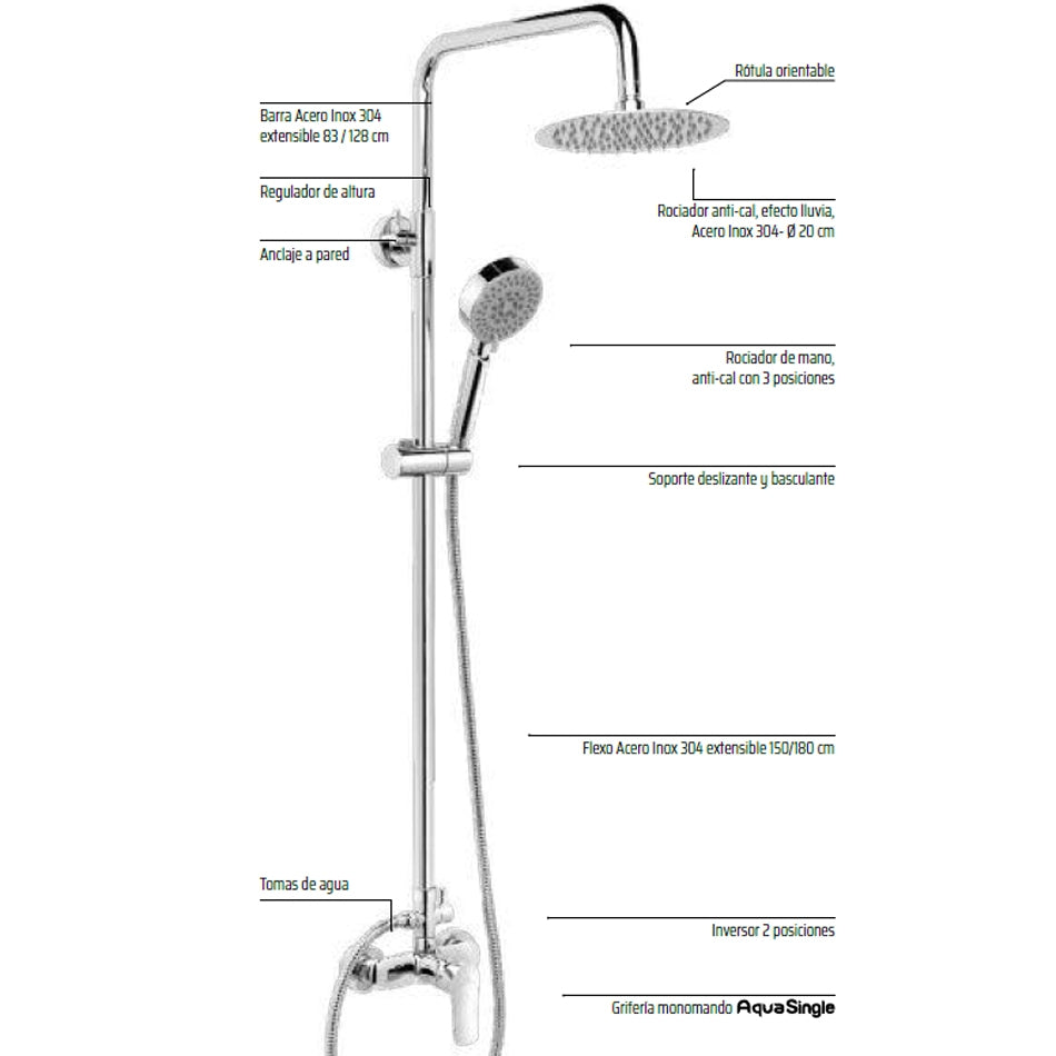 Kit Ducha Monomando SAYRO Aquassent | Barra Extensible 83-128 cm | Rociador Extraplano 20 cm | Ahorro de Agua