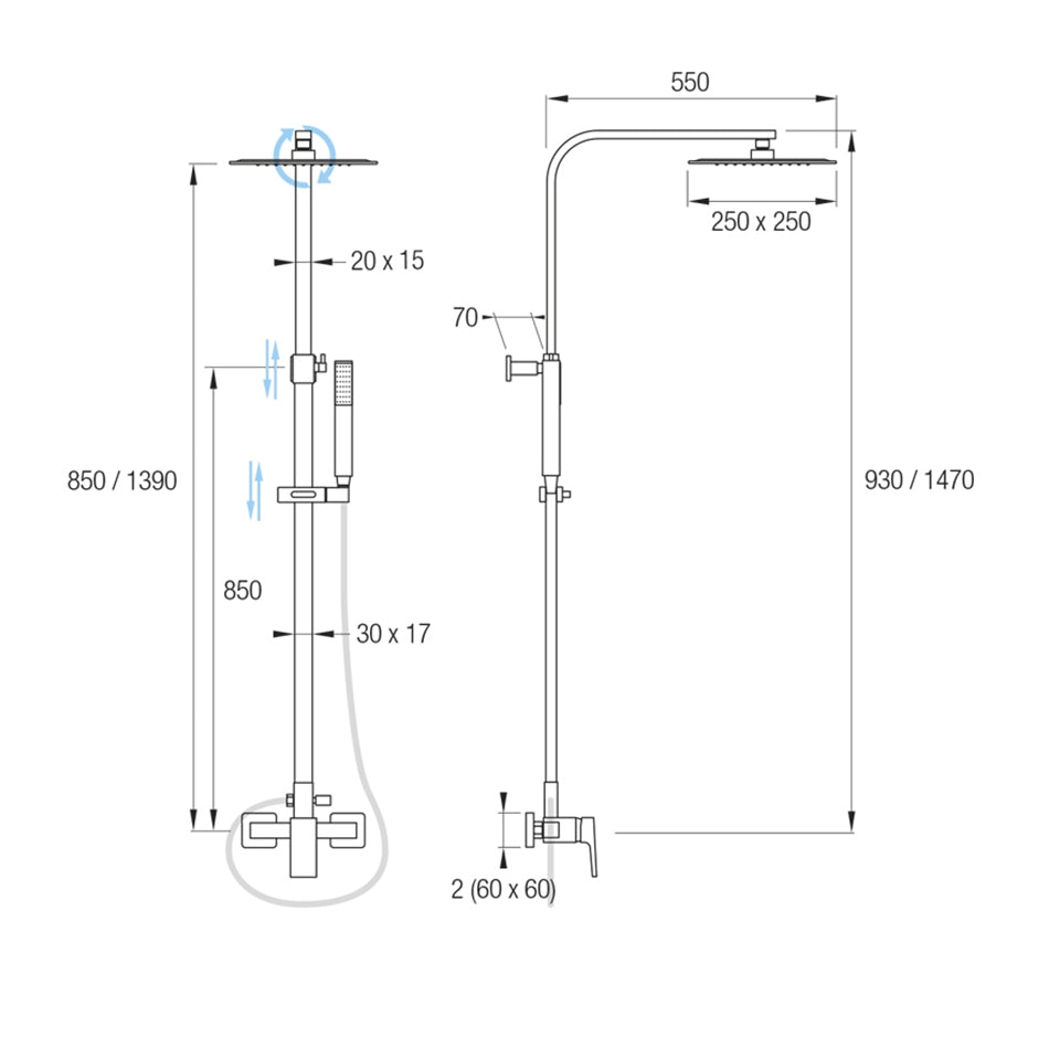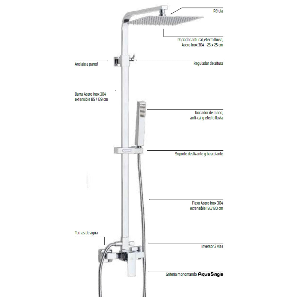 Kit Ducha SEUL Aquassent | Monomando + Rociador Cuadrado 25x25 cm | Barra Extensible 85-139 cm