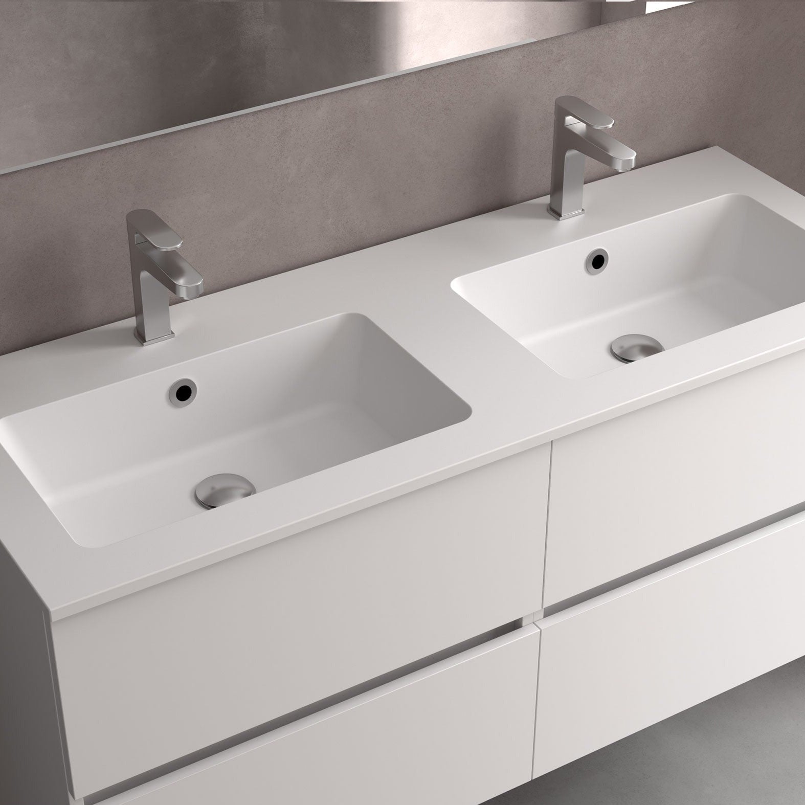 El lavabo doble Vilna MineralSolid mate combina estilo contemporáneo, funcionalidad y resistencia, convirtiéndose en la opción ideal para baños compartidos o familiares. Fabricado en MineralSolid, un material macizo de resinas de alta calidad, ofrece una superficie sin poros, reparable y resistente a manchas, golpes y bacterias, garantizando durabilidad y fácil mantenimiento.
