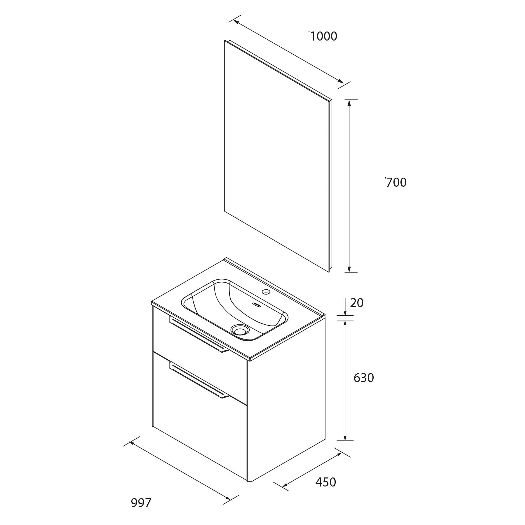 El conjunto LUVA con espejo BLOCK representa una fusión perfecta entre diseño arquitectónico y funcionalidad inteligente. Su canto oblicuo característico estiliza el mueble, rompe la rigidez visual y crea una silueta inclinada que aporta ligereza, elegancia y una presencia moderna dentro del baño.