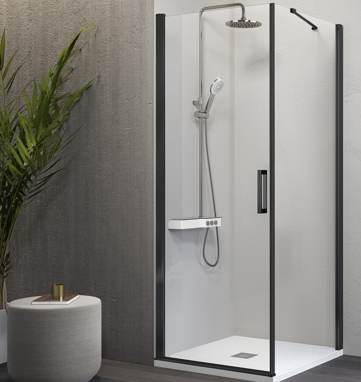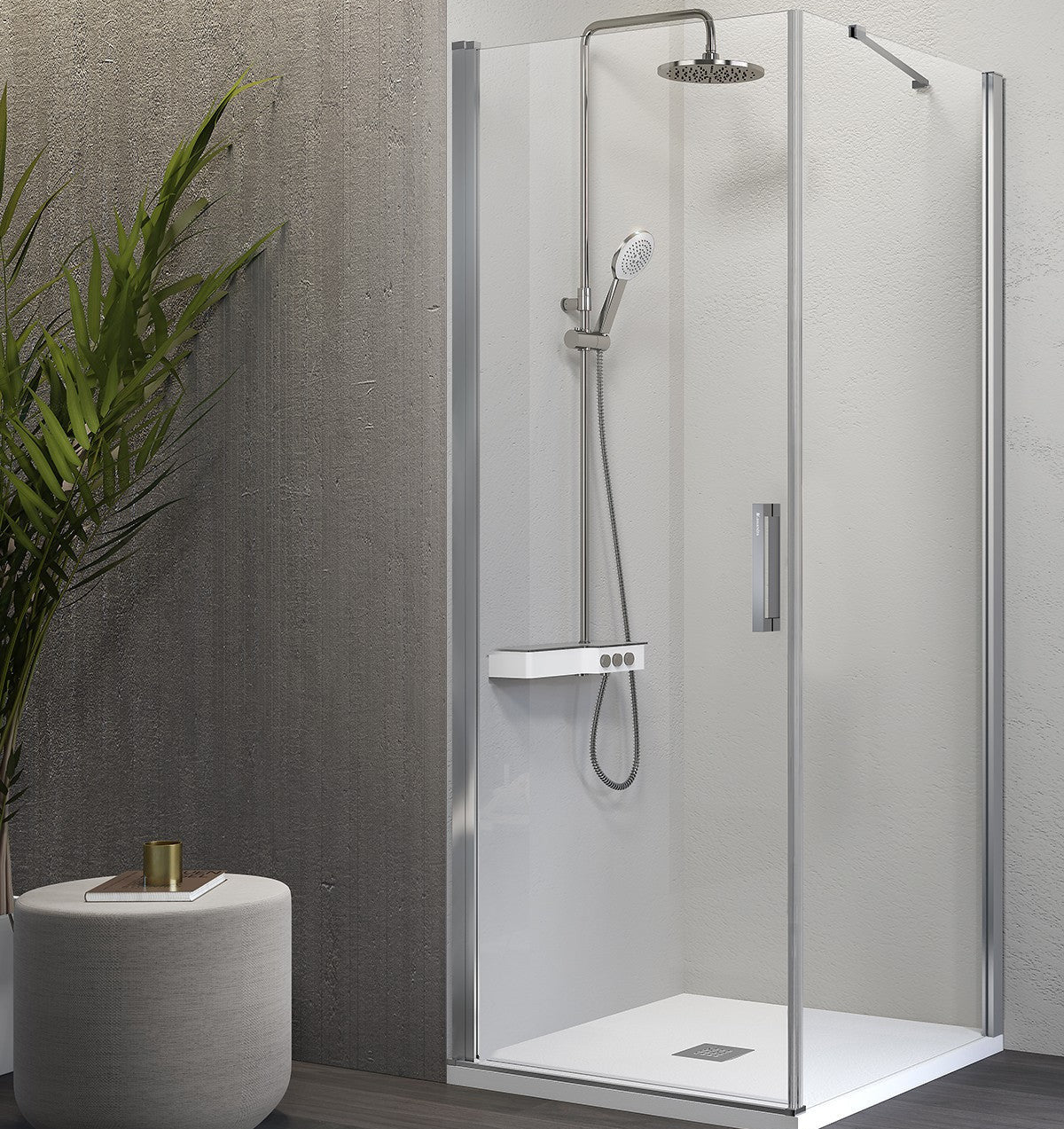 La elección ideal si buscas una solución moderna, elegante y práctica para baños pequeños o con platos de ducha en esquina. Su diseño con una puerta abatible y un lateral fijo permite un acceso amplio y cómodo, optimizando el espacio sin renunciar al estilo.