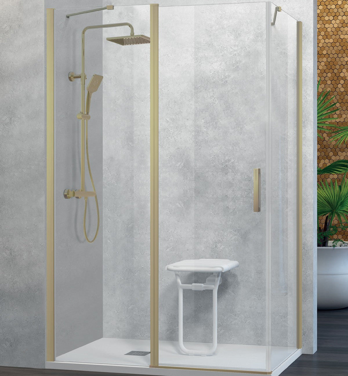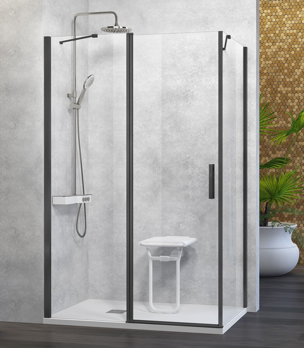 La elección perfecta si buscas una solución moderna, cómoda y funcional para tu ducha en esquina. Su diseño con un fijo frontal, una puerta abatible y un lateral fijo ofrece una apertura práctica incluso en baños con poco espacio o con elementos cercanos como el lavabo o el inodoro.