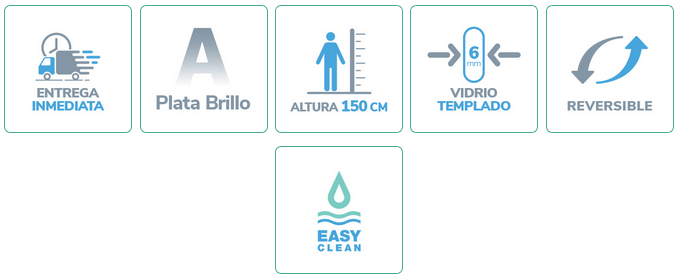 Fabricada en vidrio templado de 6 mm transparente con tratamiento antical Easy Clean, esta mampara se mantiene brillante y fácil de limpiar durante mucho más tiempo. Su perfil de aluminio anodizado en plata alto brillo aporta un toque moderno y sofisticado al baño.