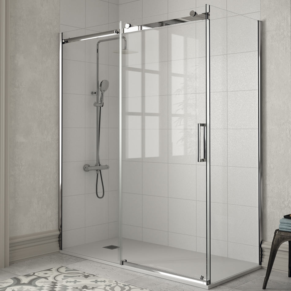 Su frontal con puerta corredera y lateral fijo optimiza el espacio en el baño, mientras que los rodamientos vistos garantizan un deslizamiento suave y silencioso. Al no llevar perfil inferior, ofrece un acceso cómodo y seguro, facilitando además la limpieza diaria.