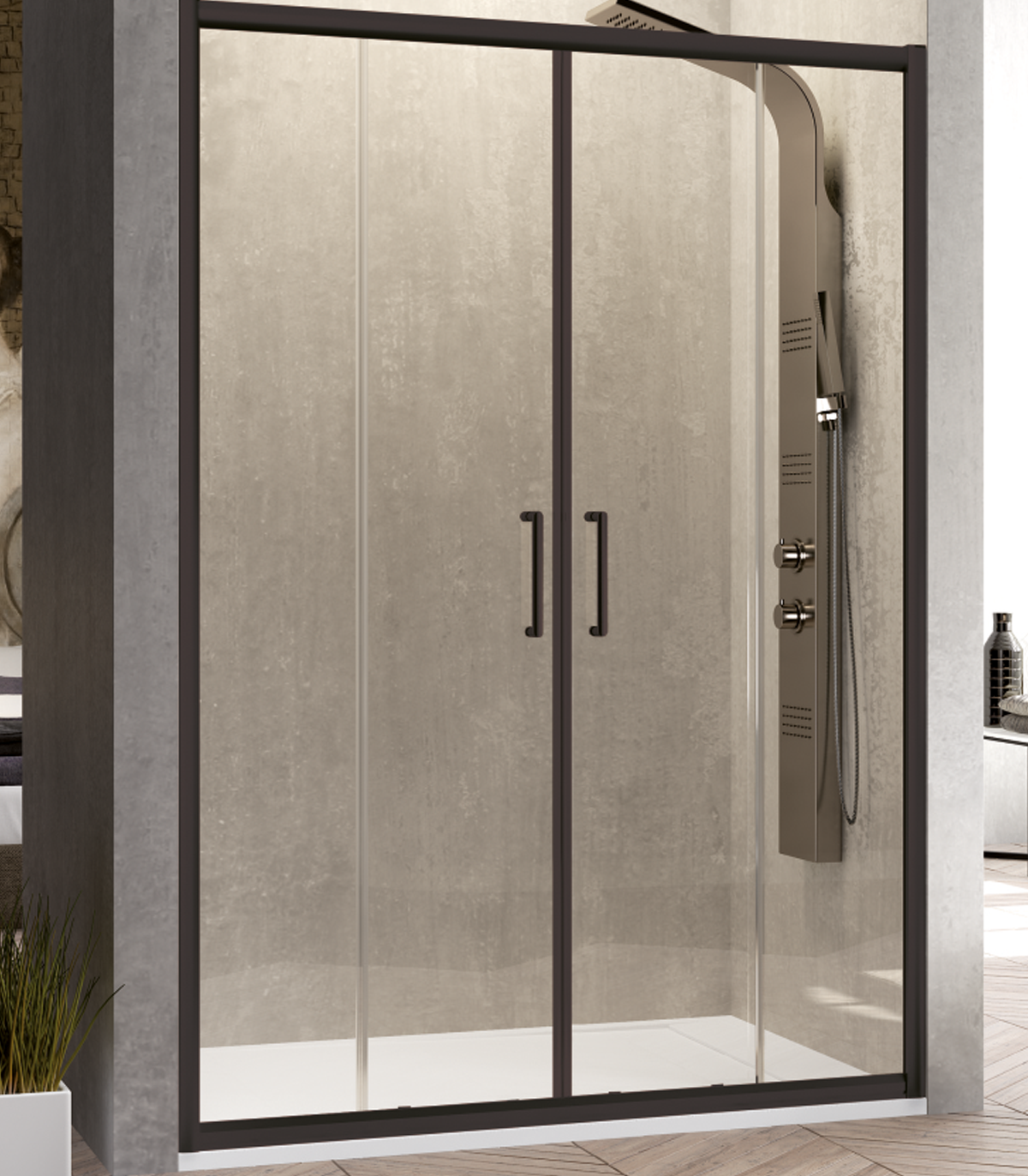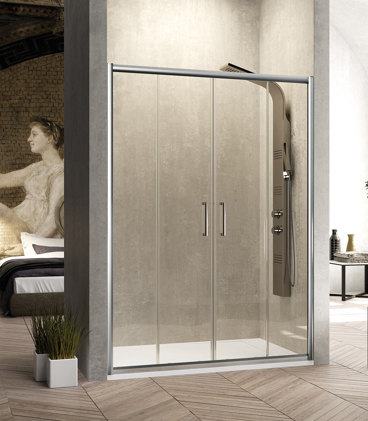 Su composición de 2 paneles fijos y 2 puertas correderas permite un acceso frontal amplio sin ocupar espacio adicional, ideal para duchas ubicadas entre tres paredes. Gracias a su cierre magnético y perfil inferior, garantiza una máxima protección contra filtraciones, manteniendo tu baño siempre seco y limpio.