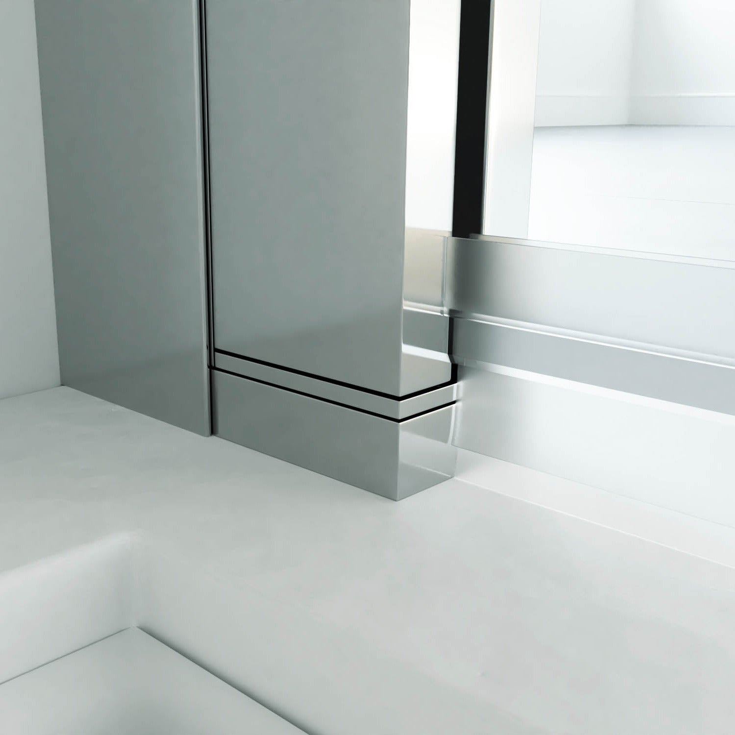 Fabricada a medida con un ancho máximo de 100 cm, la mampara CAREY combina materiales de alta calidad con acabados premium. Su estructura incorpora vidrio templado de 6 mm con tratamiento antical, bisagras de acero inoxidable y una perfilería en aluminio cromado, logrando una apariencia limpia, minimalista y duradera.