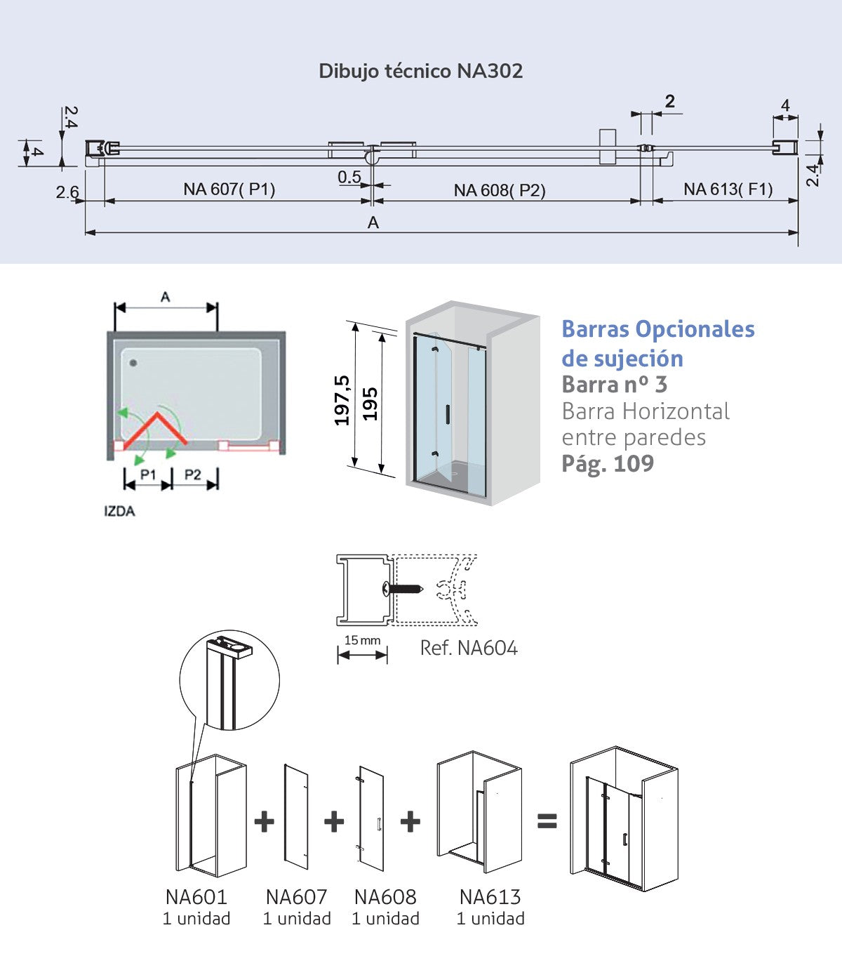 Instalación adaptable: incluye un perfil de compensación de hasta 4 cm, ideal para corregir posibles desniveles o desplomes de pared. Además, se puede añadir un perfil adicional de 15 mm si se requiere mayor ajuste.
