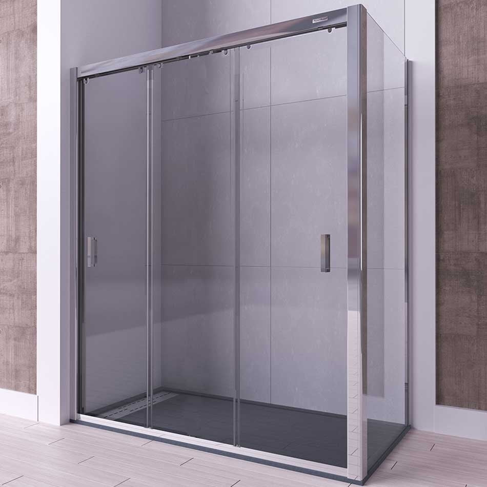 Perteneciente a la serie QUARTZ, es la elección ideal para quienes buscan una mampara frontal de alta calidad, elegante y totalmente funcional. Su innovador diseño con tres puertas correderas y opción de lateral fijo ofrece una entrada amplia, una excelente estanqueidad y una estética moderna que realza cualquier tipo de baño.