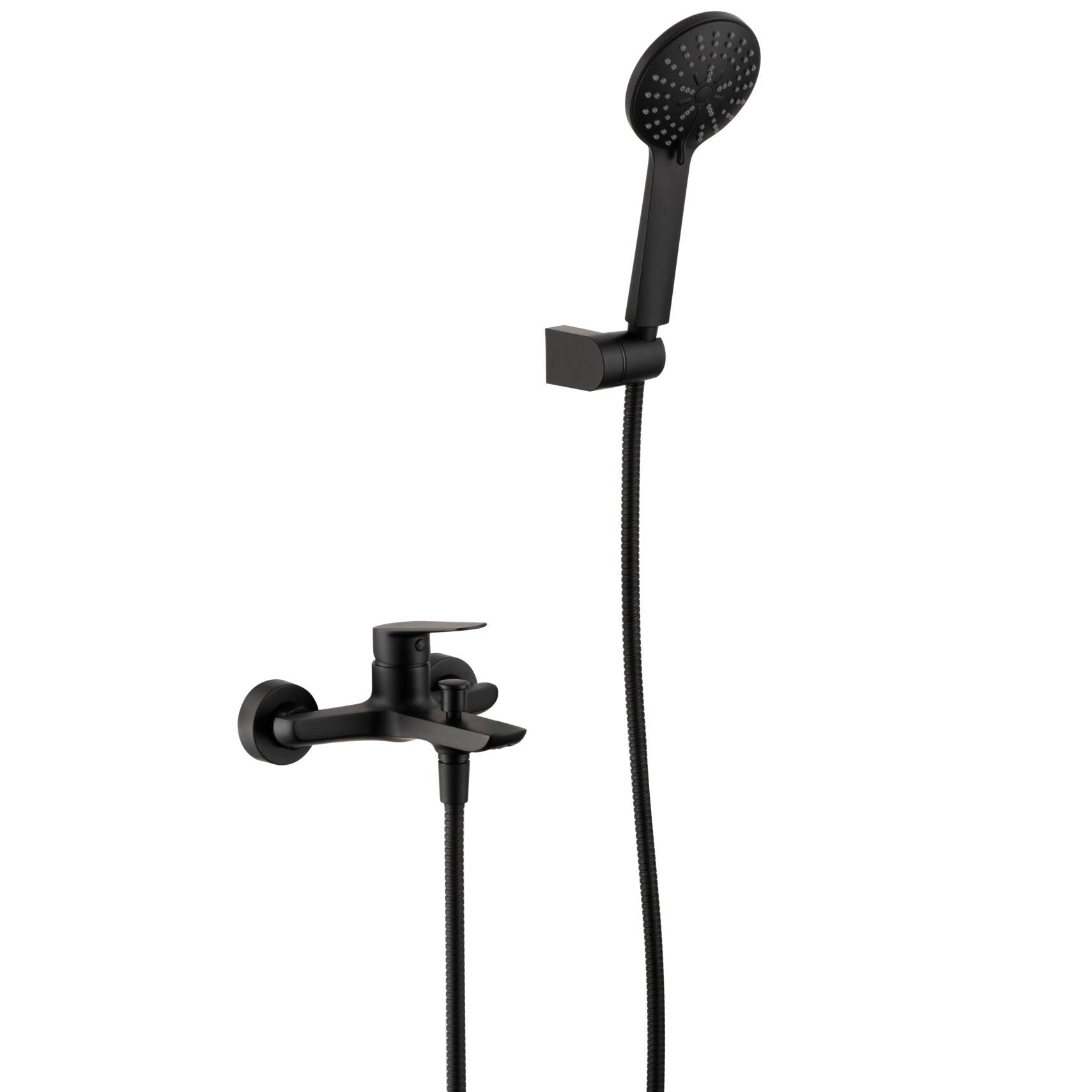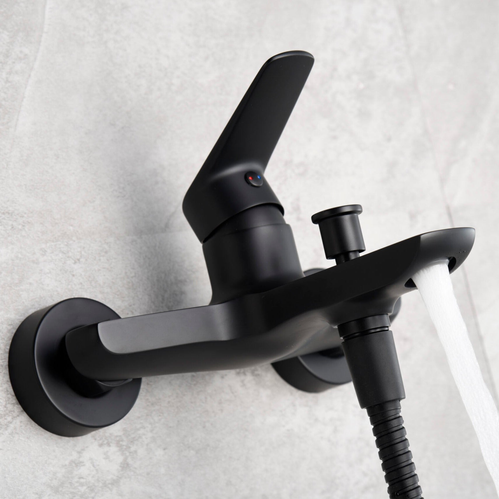 Optimiza el espacio de tu baño sin renunciar al diseño más actual. Este mezclador de superficie en negro mate te permite controlar tanto el llenado de la bañera como el caudal de la ducha con un solo elemento, fusionando funcionalidad práctica con el acabado de moda.