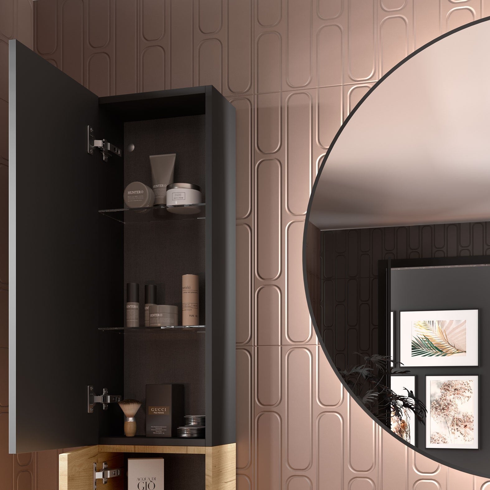 Con un diseño suspendido, actual y ligero, estos módulos son el complemento perfecto para tu mueble de baño principal. Cuentan con una puerta de apertura Push y bisagras de 110º, que facilitan un uso cómodo y silencioso. En su interior, encontrarás dos baldas de cristal regulables en altura, pensadas para mantener tus productos de higiene siempre organizados y a la vista.