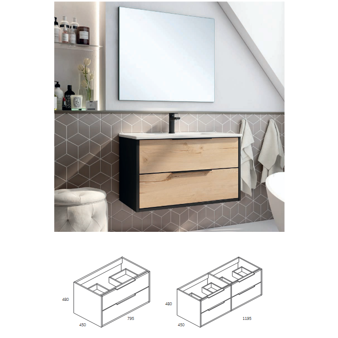 Con medidas de 80 cm o 120 cm, fondo 45 cm y altura 59 cm, este conjunto se adapta perfectamente a baños pequeños, medianos o modernos, maximizando el orden sin ocupar espacio extra.