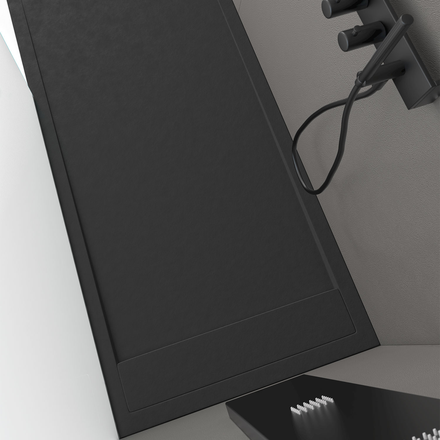 Este plato de ducha presenta un diseño semi enmarcado en tres lados, con tapa lateral del mismo material, logrando una estética elegante y uniforme. Además, su tratamiento antideslizante clase 3 ofrece máxima seguridad en el uso diario, evitando resbalones incluso en entornos húmedos.