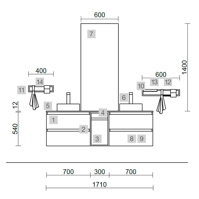 • 2 muebles de baño SPIRIT 700 con 2 cajones metálicos en acabado Roble África (697 x 540 x 450 mm).